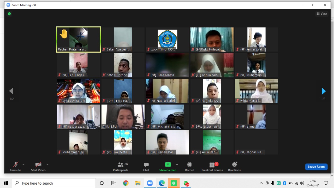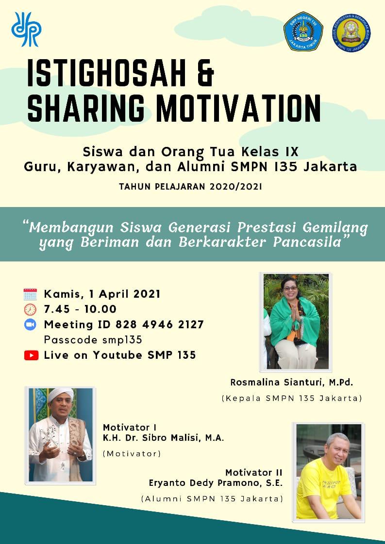 Istighosah & Sharing Motivation Siswa dan Orang Tua Kelas IX Guru, Karyawan, dan Alumni SMPN 135 Jakarta " Membangun Siswa Generasi Prestasi Gemilang yang Beriman dan Berkarakter Pancasila" Kamis, 1 April 2021 7.45...