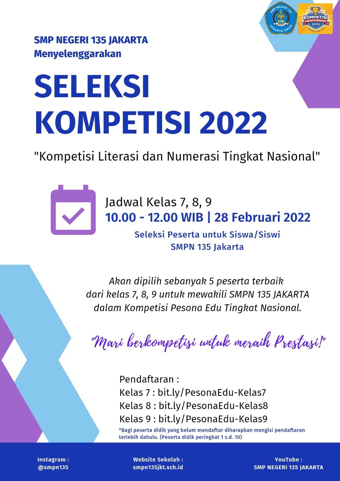 PENGUMUMAN 5 BESAR SELEKSI KOMPETISI SEKOLAH 2022 "KOMPETISI LITERASI DAN NUMERASI TINGKAT NASIONAL 2022" SMPN 135 JAKARTA KELAS 7 KELAS 8 KELAS...